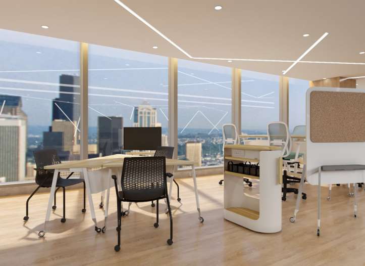 Led by technology and e-commerce companies and enabled by smart devices, the workspace evolves to elevate performance. Mobile elements - desk, screen, multi-media, storage, seats - moves and easily configures, quickly adapting to changing activities/needs, from learning to collaboration to concentrative work. By removing restrictions and encouraging self-initiative - companies seek to improve speed, adaptability and competitiveness.